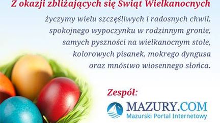 Przed nami wiosenne i pełne optymizmu święta Wielkiej Nocy. Z tej okazji chcemy złożyć najserdeczniejsze wielkanocne życzenia wszystkim Klientom i Użytkownikom serwisu Mazury.com.