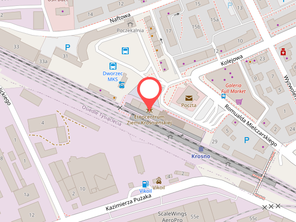 Nasz sala konferencyjno–szkoleniowa znajduje się w świetnej lokalizacji, tuż przy dworcu PKP oraz PKS, przy ulicy Kolejowej 29a w Krośnie.