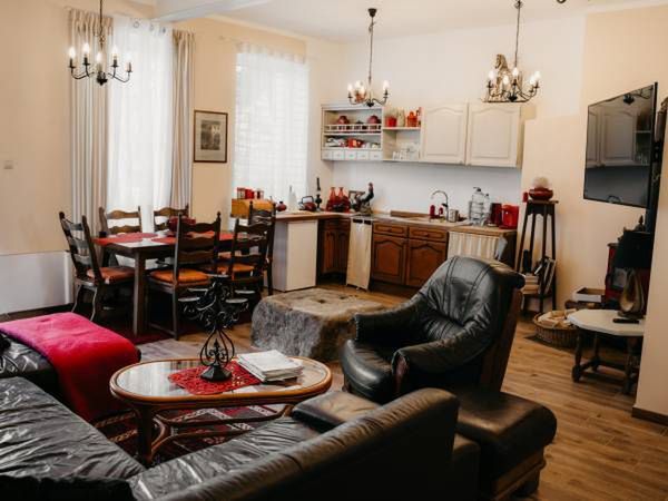 Apartament przylega do dużego living roomu. Znajduje się tam kuchnia z pełnym wyposażeniem, jadalniany stół, skórzana, rozkładana sofa oraz duży telewizor z programami satelitarnymi oraz Netflixem. Dla poprawy nastroju można jeszcze dodatkowo rozpalić kominek, który nawiązuje do dawnej funkcji kuźni. Z pokoju dziennego prowadzi wyjście na kaskadowo rozłożony ogród.