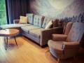 Apartament na parterze składał się z salonu z aneksem kuchennym plus dwie sypialnie. Czysto, ciepło, pachnąco i te piękne detale w górskim stylu, które przypominały, że jesteśmy na podhalu. Nowocześnie wyposażone wnętrza. Z salonu i sypialni...