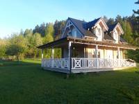 drewniany z poddaszem o powierzchni ok. 60 m2 z tarasem,