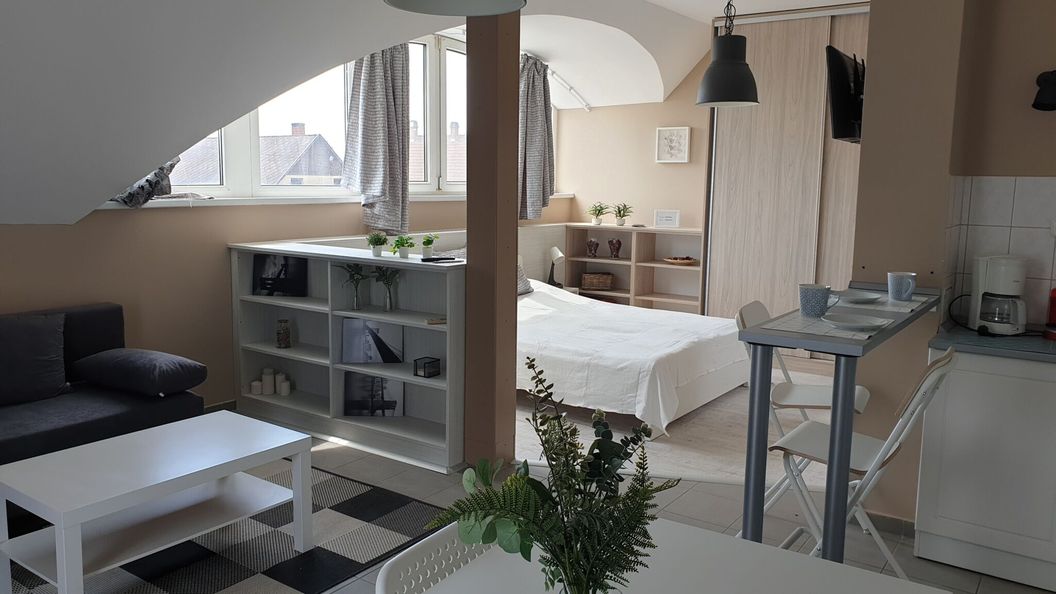 Kicsit hangos nyitott ablak mellett. A lépcső kissé meredek, kisgyerekkel jobb lett volna a földszinti apartman.