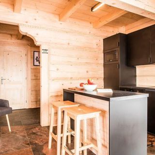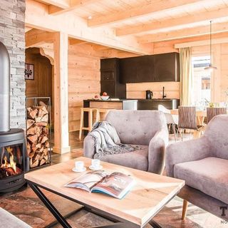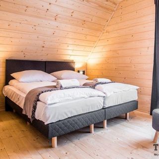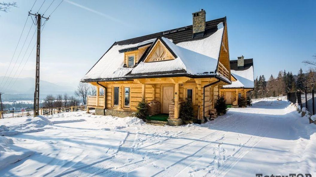 Parter drewnianego domu stanowi ekskluzywny salon z wygodną sofą, nowoczesnym telewizorem oraz klimatycznym kominkiem. Na tym samym poziomie znajduje się przestronna część jadalniana z dużym stołem, w pełni wyposażona kuchnia. Do salonu przynależy taras, na którym można podziwiać otaczający krajobraz. Na piętrze znajduja się trzy sypialnie z balkonami. Dwie z nich wyposażone są w łoża małżeńskie. W trzeciej sypialni stoją dwa pojedyncze łóżka, które można złączyć, a także wejście na antresolę, gdzie znajduje się miejsce sypialniane dla dwóch osób. W domu znajdują się trzy luksusowe łazienki, z w tym jedna połączona z sauną. Dodatkowo w domu znajduje się stół do gry w piłkarzyki oraz stół bilardowy.