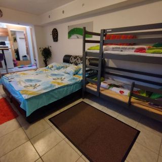 Rozsdás bárszékek, penészes csempe, ragadós evőeszközök. A zuhanyzó nagyon rossz, sem zuhanykabin, sem épített zuhany nincs. Zuhanyzáskor az egész fürdőszoba úszik a vízben - oda van készítve egy víz összehúzó. Az egyik apartmanban legalább van zuhanyfüggöny, a másikban az sincs, így minden úszik a vízben tisztálkodás után. A felső szintről érkező zajok nagyon zavaróak, rossz a szigetelés. A bérbeadó a felső szinten lakik, a bérelhető apartmanok földszinten vannak. Tulajdonképpen a garázs van átalakítva.