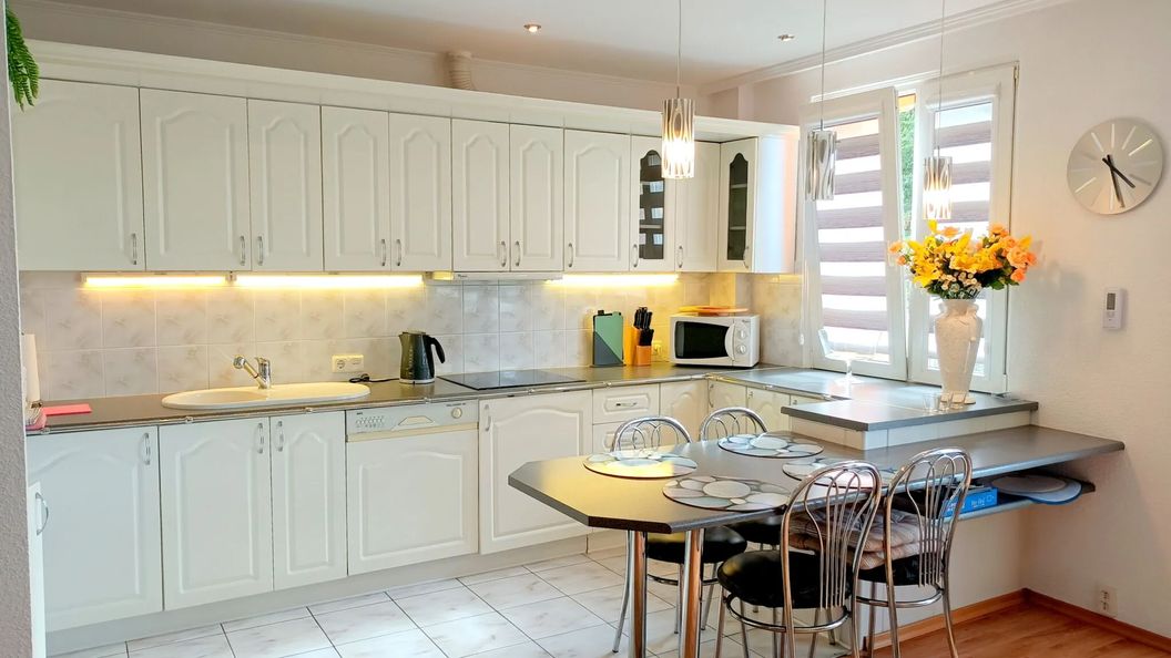 Stół jadalni zintegrowany z meblami kuchennymi i blatem kuchennym, 4 krzesła, lampy wiszące nad stołem.