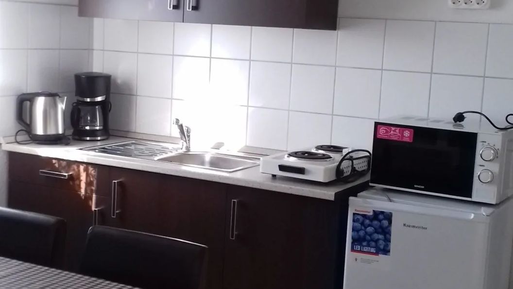 - dobrze wyposażona kuchnia (2 lodówki, mikrofala, podwójny bojler, czajnik, ekspres do kawy, toster, sztućce, talerze, ręcznik kuchenny itp.