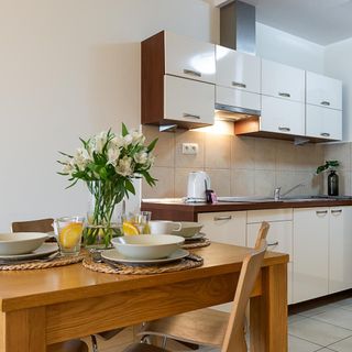 Do dyspozycji naszych Gości jest nowoczesny aneks kuchenny z lodówką, piekarnikiem, kuchenką mikrofalową, zmywarką, ekspresem do kawy oraz kompletem naczyń i akcesoriami kuchennymi. Wszystko co niezbędne, aby samodzielnie przygotować posiłki i cieszyć się wspólnymi chwilami w gronie rodziny i znajomych.