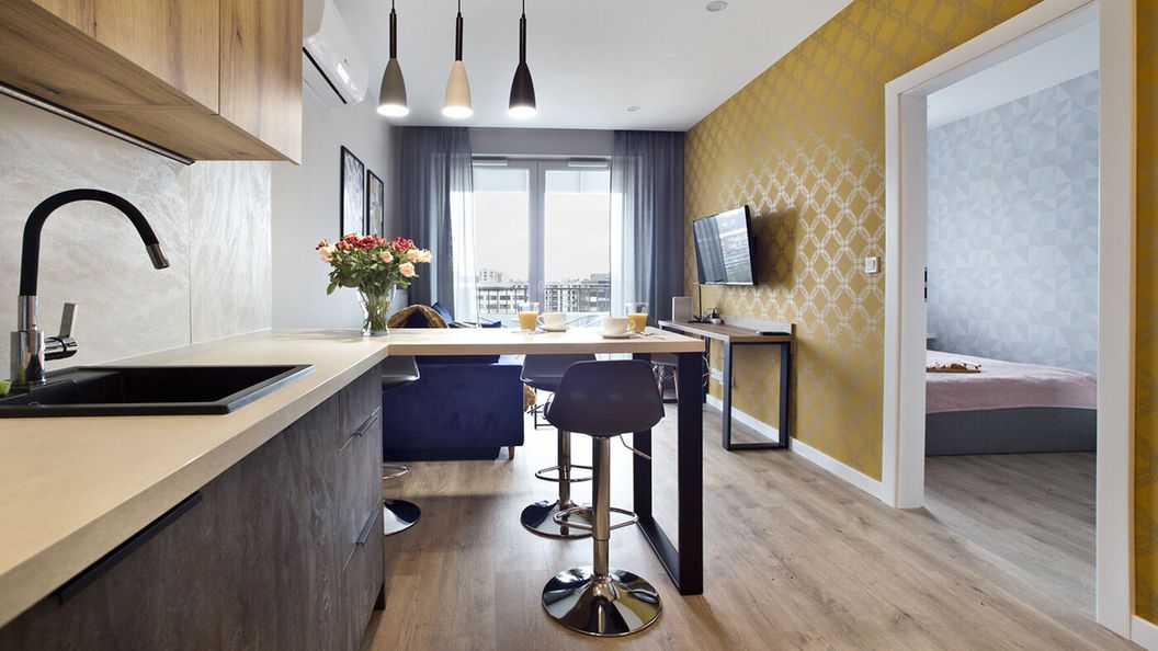Nowoczesny apartament 2- pokojowy z aneksem kuchennym, wykończony w wysokim standardzie, z najwyższą starannością i dbałością o szczegóły, zlokalizowany na 5 piętrze, na nowym osiedlu Dom Development.