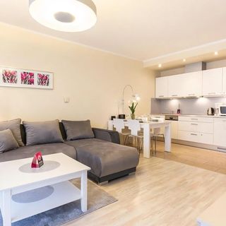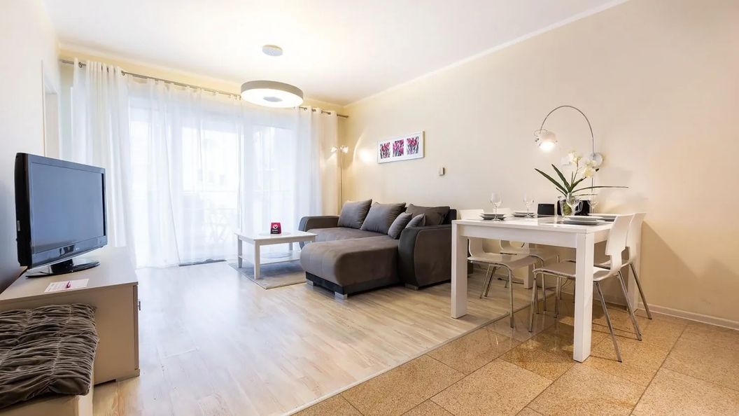 Apartament mieści się na parterze nowoczesnego budynku i oferuje prywatny ogródek z meblami wypoczynkowymi – idealne miejsce na poranną kawę lub wieczorny relaks. Wnętrze obejmuje przytulną sypialnię z podwójnym łóżkiem, przestronny salon z rozkładaną sofą, funkcjonalny aneks kuchenny oraz łazienkę z kabiną prysznicową. W apartamencie znajduje się szybkie Wi-Fi, telewizor oraz bezpłatne miejsce parkingowe w garażu podziemnym