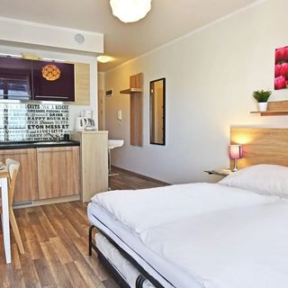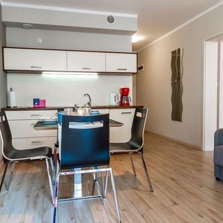 W apartamencie znajduje się w pełni wyposażony aneks kuchenny przystosowany do codziennych potrzeb Naszych Gości. Do dyspozycji oddajemy sprzęt AGD: lodówkę, płytę grzewczą, ekspres do kawy i opiekacz oraz komplet naczyń, sztućce, szklanki, filiżanki, kieliszki do wina oraz wszystkie inne akcesoria kuchenne niezbędne do samodzielnego przygotowania posiłków.