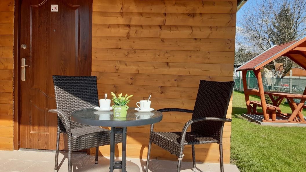 Każdy z trzech domków może pomieścić 4 + 2 osoby. Posiada 2 pokoje dwuosobowe i przestronny salon (rozkładana sofa dla 2 osób).