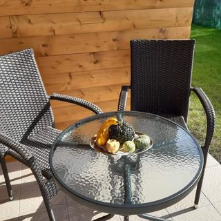 Każdy dom ma zadaszony taras ze stołem i krzesłami. Trawiasty dziedziniec ma 2 leżaki na dom.
