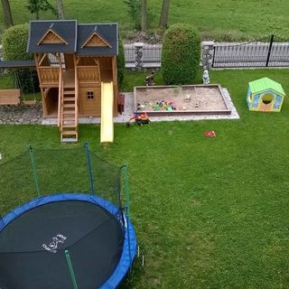 Na zewnątrz jest duży ogród z trampoliną, placem zabaw piaskownicą, zabawkami leżakami i grillem z altanką i opałem.