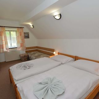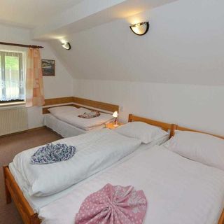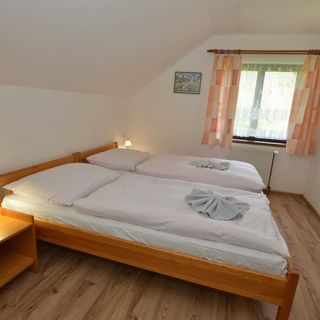 wrzesień 2019Penzion je vybaven starším nábytkem, ale na přespání stačí. Pokoj byl čistý. Okolí ubytování je moc pěkné. Ticho, lesy na procházky ideální. Měli jsme sebou psa (střední rasy) a nebyl problém. Jediné mínus celého pobytu bylo, že jsme měli pokoj nad hospodou a byl slyšet hluk. Bylo to pouze jeden večer tak se to dalo vydržet. Od půlnoci byl klid. Dokupovali jsme si snídaně a večeře. Snídaně byla každé ráno připravena na stole (sýr,džem,paštika...atd) každý si vybere. K večeři jsem si dala César salát a jednou guláš. Vše moc dobré. Potom bych chtěla upozornit na dost strmé schody do patra. Starší člověk by mohl mít problém. Parkování je přímo u objektu. Wifi free. TV na společné chodbě.