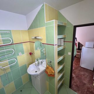 Příšerné vchodové dveře do apartmánu. Ve sprše chybí jak uchycení sprchy tak mistička na odložení mýdla nebo šamponu. Vybavení kuchyně hrníčky, příbory, talíře mnoho různých druhů. Jako každý pes jiná ves. U ledničky nedrží zavřené dvířka mrazáku.