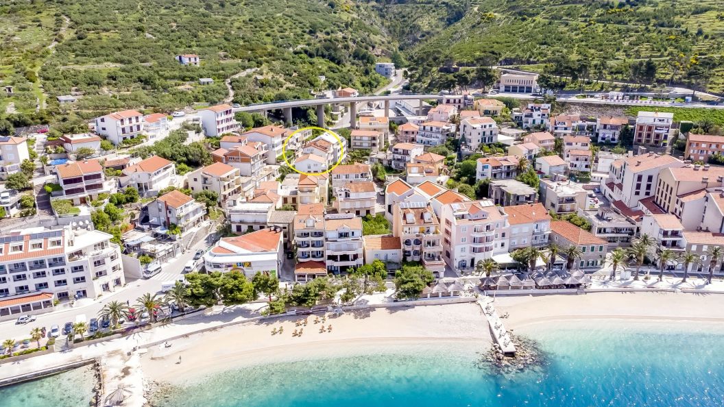 Jednym z głównych atutów obiektu jest jego lokalizacja. Apartamenty znajdują się zaledwie 100 metrów od kamienistej plaży, co gwarantuje łatwy dostęp do krystalicznie czystych wód Adriatyku. Co więcej, w tej samej odległości dostępna jest również plaża piaszczysta, co daje gościom rzadką możliwość wyboru między dwoma typami wybrzeża w zależności od ich preferencji.