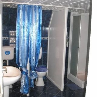 Egy légtérben 3 zuhanykabin, 2 WC és a mosdó.