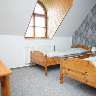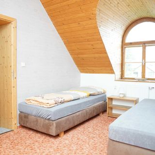 V pokoji pro dva nacpané tři postele, dvě osoby se sotva vyhnou natož tři , jedna garnyž na závěs i záclonu, dvě židle, jedna lampička a dva noční stolky, po cestičce do pokojů 1 - 3 se potkávající nemají kam vyhnout a jeden musí překročit řetěz, atd.,,,,