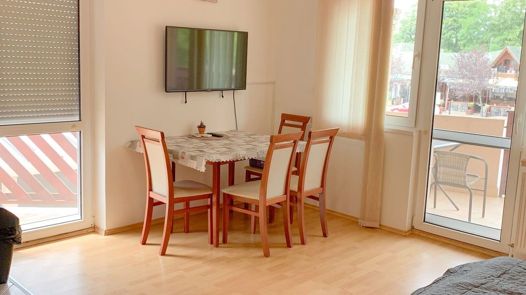 Az apartmannal szemben lévő zenés szórakozóhely hajnal 5-ig tart nyitva ami a pihenést lehetetlenné teszi ezért kisgyermekes családoknak nem ajánlom valamint pihenni vágyóknak sem . Az apartman szomszédságában lévő kertmozi nagyon hangos minden behallatszik , de legalább nem tart hajnalig. A foglaláskor visszaigazolt parkoló nem valós parkolni az épület előtti parkolóban ingyen lehet ami tényleg egy lépésre van az ingatlantól vagyis a valóságban csak lehetne mert mindig tele van. Nagyon korán reggel lehet leparkolni és nagyon késő este egyébként napközben teltház van. Aki szeretne kicsit elmenni kirándulni kocsival annak reménytelen napközben visszaparkolni nem csak az apartman előtt de még a közelében is zsúfolásig vannak a kocsik. Ennyi pénzért szerintem már egy parkolóhely a minimum lenne. Ha az ajánlatban meg lett volna nyíltan írva hogy parkolás utcán akkor biztosan nem ide foglalunk.