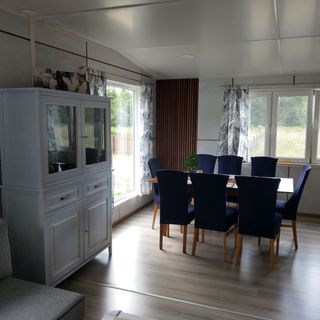 Pokój dzienny: Sofa, telewizor z płaskim ekranem, stół, 8 krzeseł.