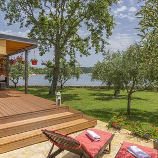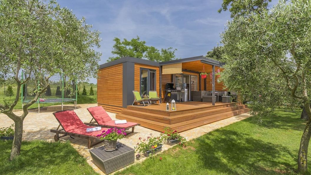 Beach House Ive to nowy piękny mobile home dla 6 osób z basenem i jacuzzi w gaju oliwnym nad brzegiem morza z pięknym widokiem na morze i Zatokę Pomorską.