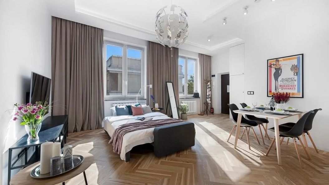 Przestronne mieszkanie w ścisłym centrum Warszawy, z wnętrzami zaprojektowanymi i urządzonymi przez architektów, w nowoczesnym stylu skandynawskim. Mieszkanie znajduje się na czwartym piętrze w kamienicy z windą. Apartament jest komfortowo urządzony i w pełni wyposażony, składa się z dwóch pokoi z aneksem kuchennym i łazienką.