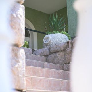Kamienista plaża jest w odległości 100 meters, wybetonowanej plaży 100 meters.