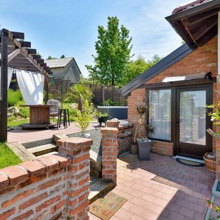 - Dom wykonany z drewna i cegły