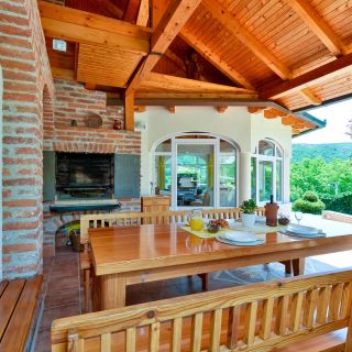 Posesja jest w pełni ogrodzona, co zapewnia prywatność. Na terenie obiektu znajduje się ogród z meblami wypoczynkowymi, miejsce na grilla oraz palenisko. Z myślą o najmłodszych przygotowano plac zabaw z huśtawką, piaskownicą i zjeżdżalnią, a także wewnętrzny kącik zabaw i gry.