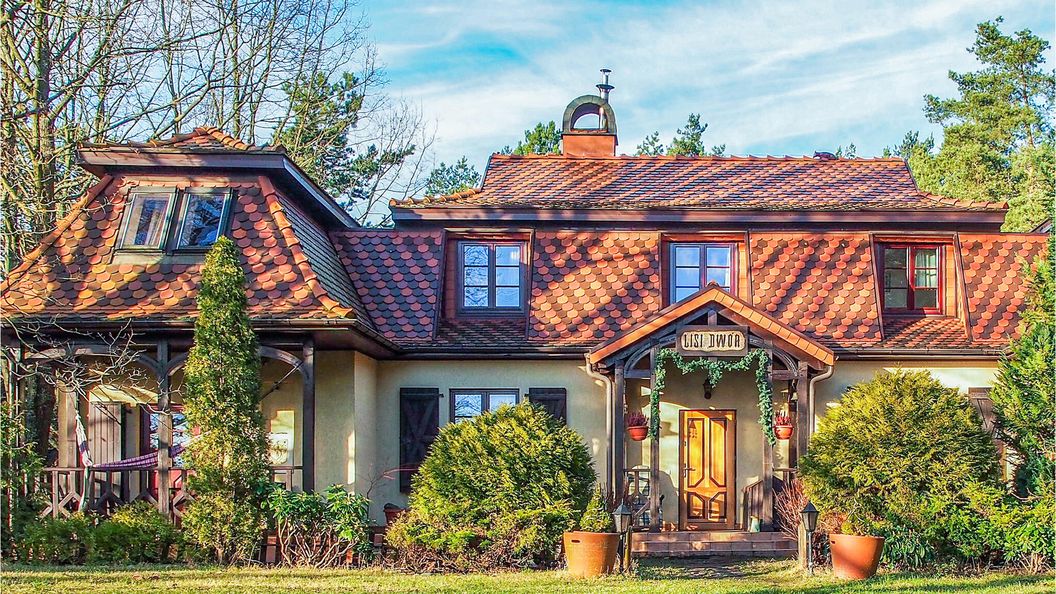- Dom wykonany z drewna i cegły