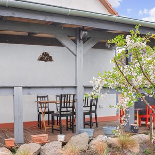 - Dom wykonany z drewna i cegły