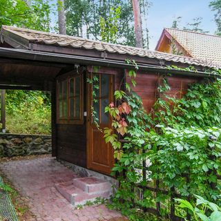 - Dom wykonany z drewna i cegły
