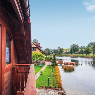 - Dom wykonany z drewna i cegły