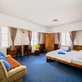 Kousek je to do potravin, do servisu i na sjezdovky. Restaurace s vynikajícím jídlem. Parkování hned u pensionu. Velmi příjemný a vstřícný personál. Neřekla bych, že se nám něco vyloženě nelíbilo, nejsme nároční, ale spíše jde o postřehy na zlepšení. Na pokoji A. chyběl závěs na jednom okně, neopravená garnyž ve zdi. Na pokoji 6. jsme postrádali poličku na hygienické potřeby pod zrcadlem v koupelně, také třeba odkládací kelímek na kartáčky, dále polička na toaletní potřeby ve sprchovém koutu, sprchový kout měl špatný odtok. Chyběly háčky na ručník na ruce hned vedle umyvadla, háčky byly, ale až na vnitřní straně dveří, pak ale byla celá zem pokapaná, my si teda přehazovali ručníky přes sprchový kout. Zima ve společenské místnosti - paní majitelka nás ale upozornila. Řešili jsme jinak. Chybějící skříně na pokojích, v některých chyběly nebo byly jen malé poličky u postelí, v lyžařském období nedostatečné. My si nějak poradili. Ale někdo může být nespokojen. Rádi se sem opět vrátíme, děkujeme.