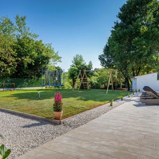 Na terenie ogrodzonej posesji przygotowano przestrzeń do rekreacji na świeżym powietrzu. Goście mogą korzystać z mebli ogrodowych oraz grilla. Z myślą o aktywnym wypoczynku udostępniono trampolinę, huśtawkę, a także boiska do gry w piłkę nożną i siatkówkę. Dostępny jest również sprzęt do badmintona.