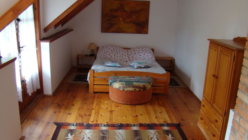 W domu letniskowym na piętrze znajdują się 2 komfortowe sypialnie. Główna sypialnia połączona jest z tarasem z którego rozpościera się przepiękny widok na jezioro Wulpińskie. Wyposażona jest w wygodne łoże małżeńskie. Drugiej sypialni znajdują się 2 pojedyncze łóżka. Obie sypialnie są połączone salonem, w którym znajduje się telewizor, 1 pojedyncze łóżko oraz mała sofa. Parter jest otwarty, połączony z jadalnią oraz otwartą kuchnią, łazienką oraz salonem, w którym znajduje się kominek.