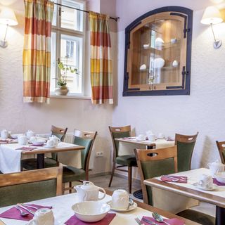Snídaně tragická. Muselo se dojít mimo penzion cca 300 m, o čemž při objednávání pokoje není nikde zmínka. Snídaně se podává v knihkupectví, kde je velmi malá kapacita. Výběr velice skromný - žádné ovoce, muslli, cereálie nebo jogurty, chléb jsme si vytáhli z igelitu, pouze margarín z původním půl kilovém balení, na malém talířku pár koleček šunky, sálám a sýru pro všechny, marmeláda. Obsluha velmi pomalá a nestíhá nic doplnit, nebyla ani voda. Káva studená a na dvě míchaná vejce jsem čekali 15 min. Nedostatek nádobí, džus jsem pili z šálku na kávu, dokonce se nás slečna zeptala, jestli nám může vejce dát na stejný talíř, kde jsem před tím měli marmeládu (zřejmě nemají myčku). Platbu za pokoj pouze v hotovosti.