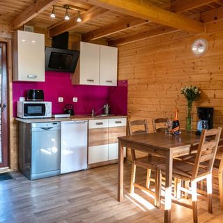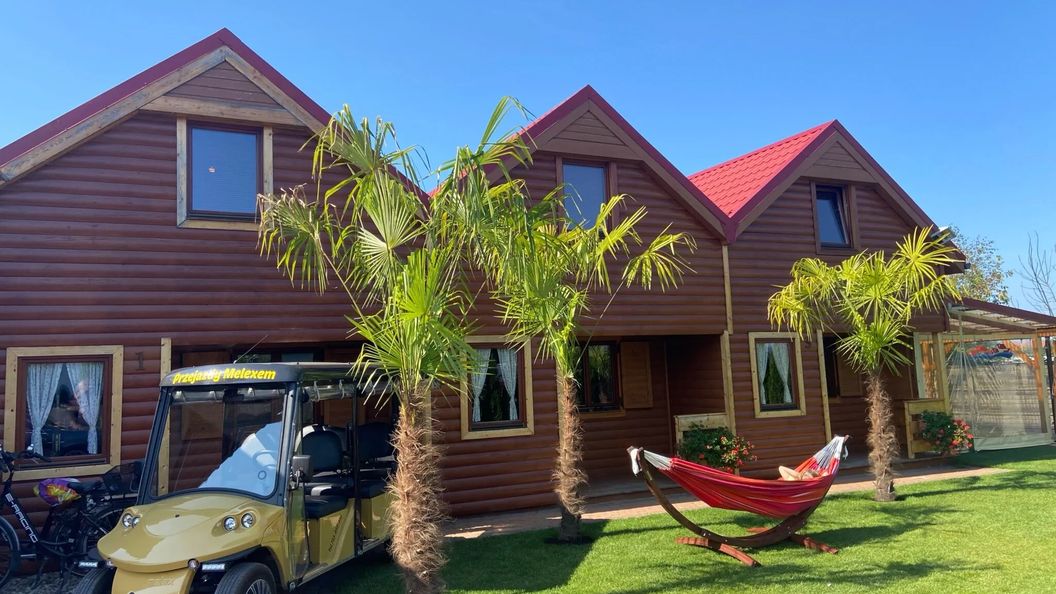 Obiekt oferuje zakwaterowanie w dwukondygnacyjnych, ocieplanych domach o powierzchni około 50 m², przeznaczonych dla maksymalnie 8 osób. Każdy dom posiada dwie zamykane sypialnie na piętrze, a na parterze znajduje się salon z częścią wypoczynkową i aneksem kuchennym oraz łazienka. Do dyspozycji gości są również dwa tarasy – zadaszony z przodu oraz dodatkowy z tyłu, wyposażony w meble ogrodowe.