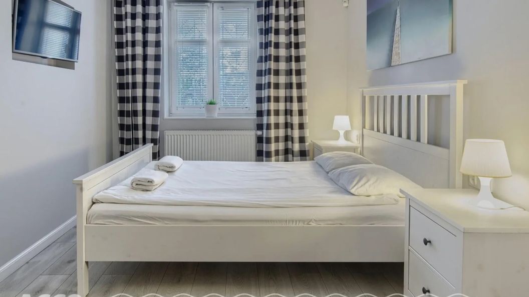 W układ studia wchodzi pokój z łóżkiem dwuosobowym oraz rozkładaną sofą idealną dla dzieci do lat 12., wyposażony aneks kuchennym oraz łazienka.
