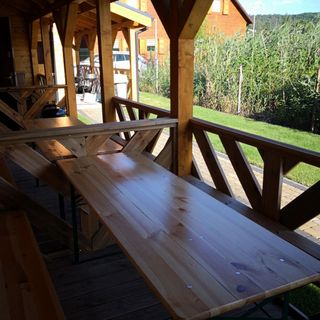 Drewniany własny taras przed wejściem do domku daje nam możliwość by w spokoju wypić poranną kawę, czy spożyć posiłek z rodziną.