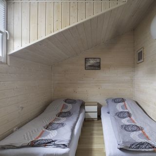 Przytulne drewniane domki. Wyposażone w dwie sypialnie dwuosobowe na górze ( w każdym dwa pojedyncze łóżka), na dole jest salon w którym jest sofa dwuosobowa rozkładana (z możliwością spania dla 2 osób), salon połączony z aneksem kuchennym który jest w pełni wyposażony ( płyta indukcyjna, lodówka, okap, sztućce, naczynia, ekspres do kawy),co pozwala na samodzielne przegotowywanie posiłków.