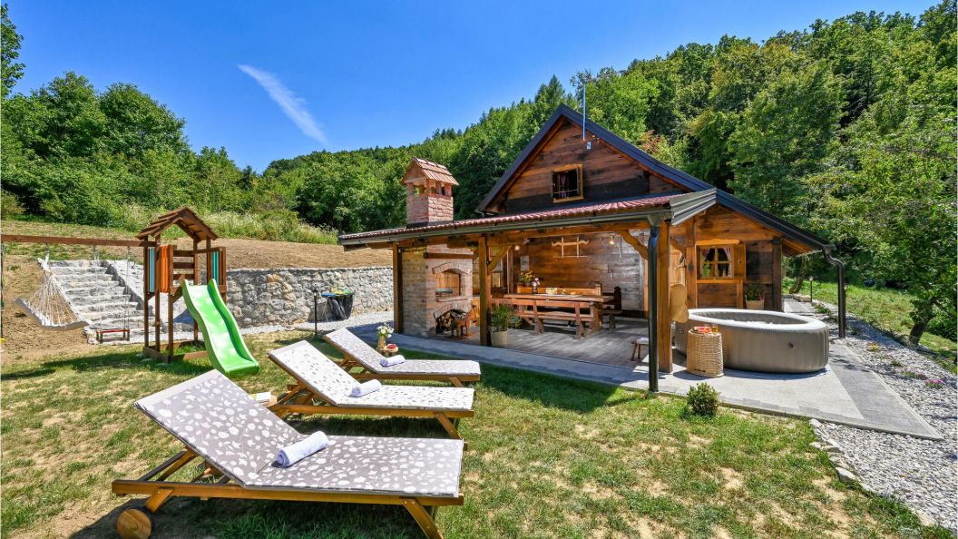 Drewniany dom gościnny położony w miejscowości Varaždin Breg w Chorwacji, usytuowany na otwartej działce z ogrodem i meblami ogrodowymi.