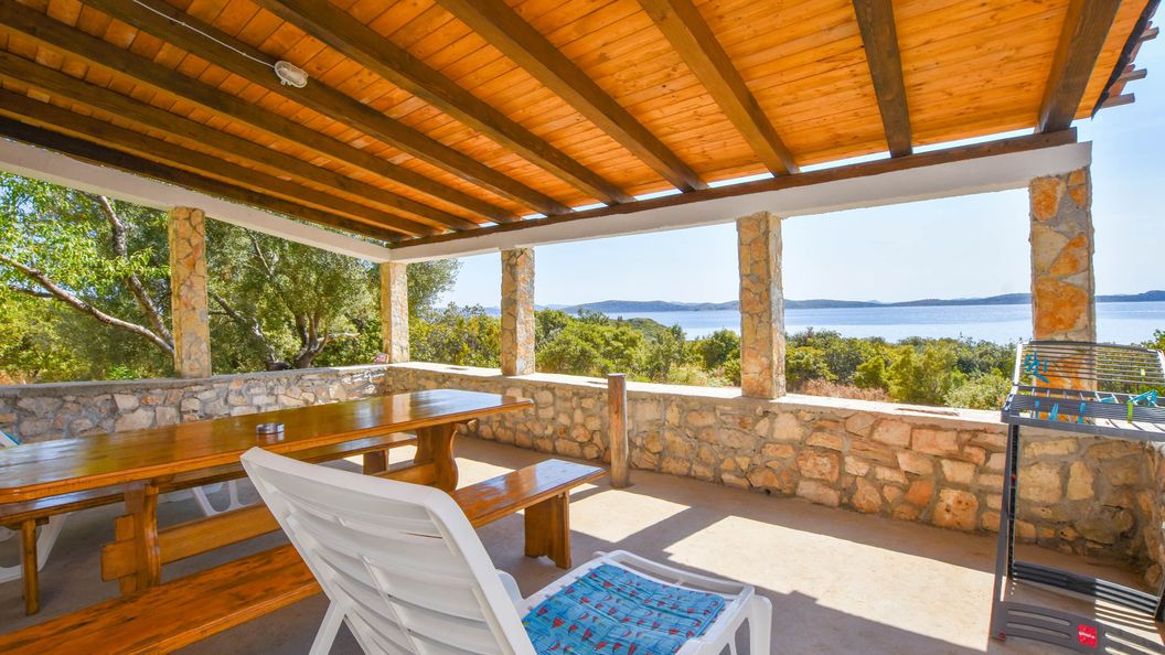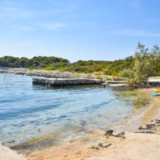 Krásná lokalita s výhledem na NP Kornati. Písečná pláž. Soukromí. Možnost ubytování se psy - možnost koupání psů v moři - na severní straně ostrova je všude zákaz. Krásný výhled z terasy na západ slunce. - Chtělo by to paravan k venkovní sprše :D Horší přístupová cesta. Pouze užitková voda.