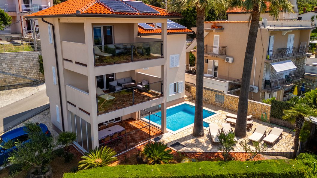Das Haus bietet mit 4 Zimmern, die jeweils mit einer Kleiderkammer, einem Bad und einem WC ausgestattet sind, höchsten Komfort für 8 Personen. Alles war sehr sauber, die Vermieterin war ausgesprochen freundlich und hat bei Nachfragen sofort reagiert. Auch technisch ist alles einwandfrei (Klimaanlage in jedem Zimmer - auch als Heizung nutzbar). - Der Ausblick von den Terrassen/Balkonen ist grandios. Die Treppen in die oberen Stockwerke sind auch für einen kleineren Hund mühelos begehbar. Schöne Gassigänge sind in 5 Minuten unten am Meer zu erreichen. Das sehr feine Restaurant Gonar ist 100 Meter entfernt. Sowohl Lopar als auch Rab sind von hier aus mit dem Auto schnell zu erreichen. Der Pool sah zwar verlockend aus, das Wetter war aber leider zu kalt zur Nutzung. - Volle Empfehlung, vor allem auch für größere Familien.