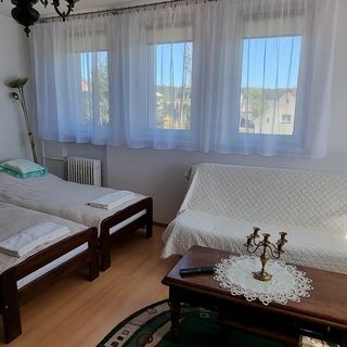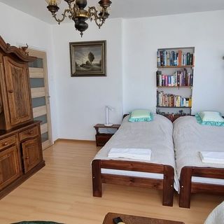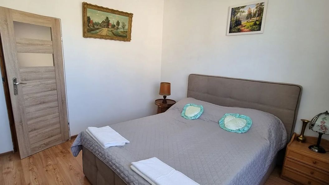 W jednej sypialni jest dwuosobowe łóżko, w drugiej sypialni są dwa jednoosobowe łóżka i dwuosobowa wersalka. Dodatkowo można skorzystać z łóżeczka turystycznego dla dziecka.