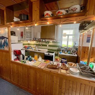 Kuchnia: 2 mikrofalówki, 2 lodówki, zamrażarka, piekarnik, płyta, 2 czajniki, ekspres na kapsułki, zmywarka, toster, duża płyta indukcyjna, kompletne wyposażenie kuchenne dla grup