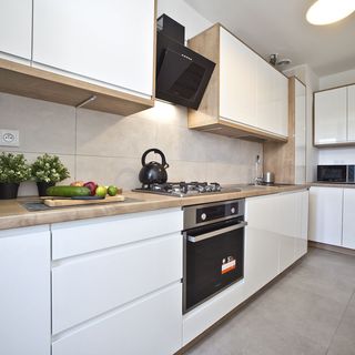 aneks kuchenny: zmywarka, mikrofalówka, ekspres ciśnieniowy, płyta gazowa, piekarnik, czajnik, naczynia, garnki