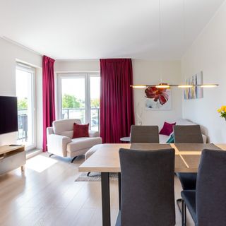 Ten nowoczesny, komfortowy apartament składa się z dwóch sypialni, salonu, aneksu kuchennego i łazienki z WC. W jednej sypialni znajduje się duże łóżko małżeńskie, a w drugiej 2 łóżka pojedyncze z możliwością złączenia w jedno duże łóżko małżeńskie. Apartament jest idealny zarówno na rodzinne wakacje, jak i na podróż służbową. Przestrzeń jest funkcjonalnie zaprojektowana, z przejrzystym, jasnym wystrojem nadającym apartamentowi prosty, a jednocześnie wyrafinowany charakter. Wygodę pobytu zapewnia szereg udogodnień, takich jak bezpłatne łącze Wifi, telewizor z płaskim ekranem oraz w pełni wyposażony aneks kuchenny. Goście mogą zrelaksować się na przestronnym balkonie wyposażonym w meble ogrodowe.