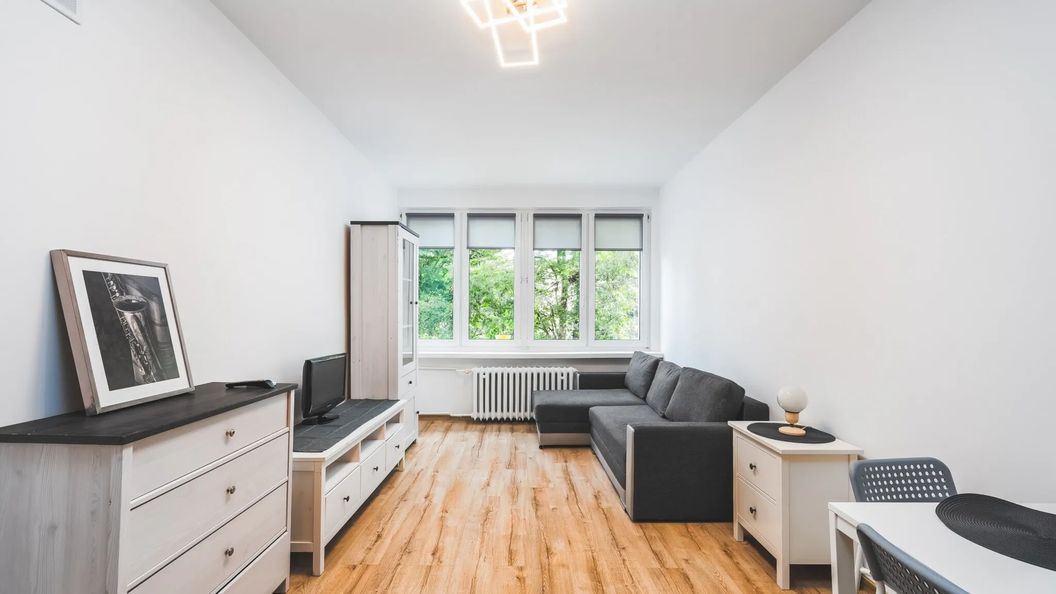 Mieszkanie jest umeblowane, świetnie podzielone, posiada sypialnię z łóżkiem o szerokości 160 cm, salon z rozkładaną sofą TV LED 42 cale,częścią jadalną oraz wypoczynkową i ogromną szafę w zabudowie.