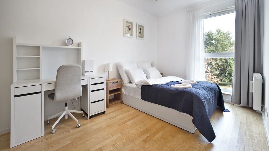 Mieszkanie jest w pełni umeblowane. W małym pokoju znajduje się łóżko, biurko oraz przestronna szafa wnękowa.
